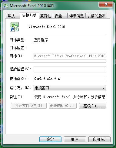 步骤2:在弹出的“Microsoft Excel 2010属性”对话框中,切换至“快捷方式”选项卡。将光标定位置“快捷键”文本框,然后【ctrl】+【Alt】+【A】键,可以看到,快捷键栏就变成了“Ctrl+Alt+A”了。