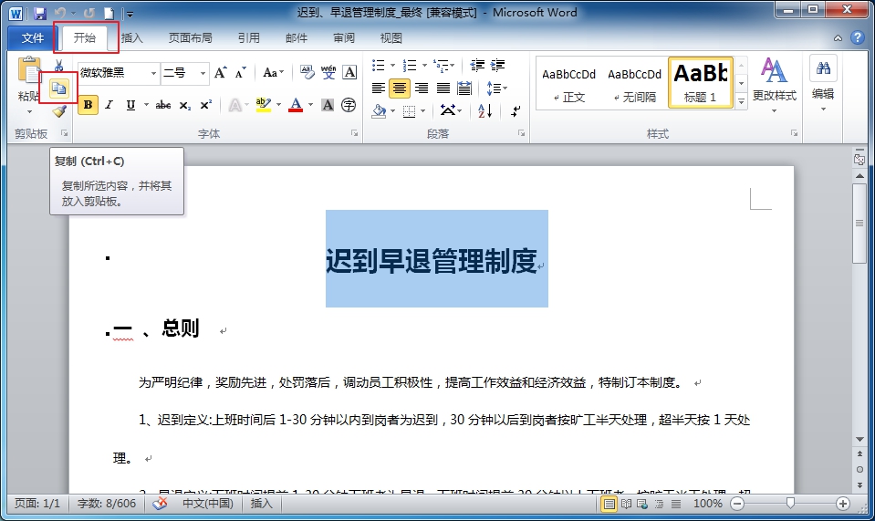 方法2:选择文本“迟到早退管理制度”,然后切换到【开始】选项卡,在【剪切板】组中单击【复制】按钮。