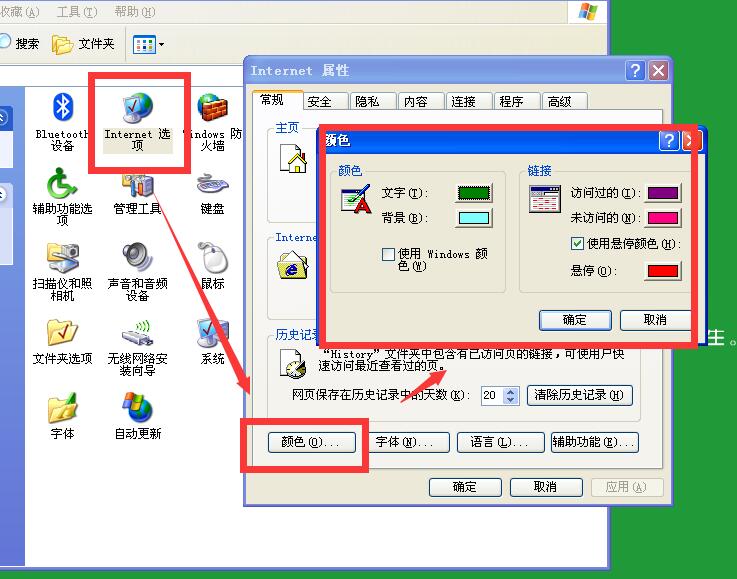 我们可以通过以下方式修改背景或文本颜色。我们单击“控制面板”中的“Internet选项”,在“常规”选项卡中,单击“颜色”命令。